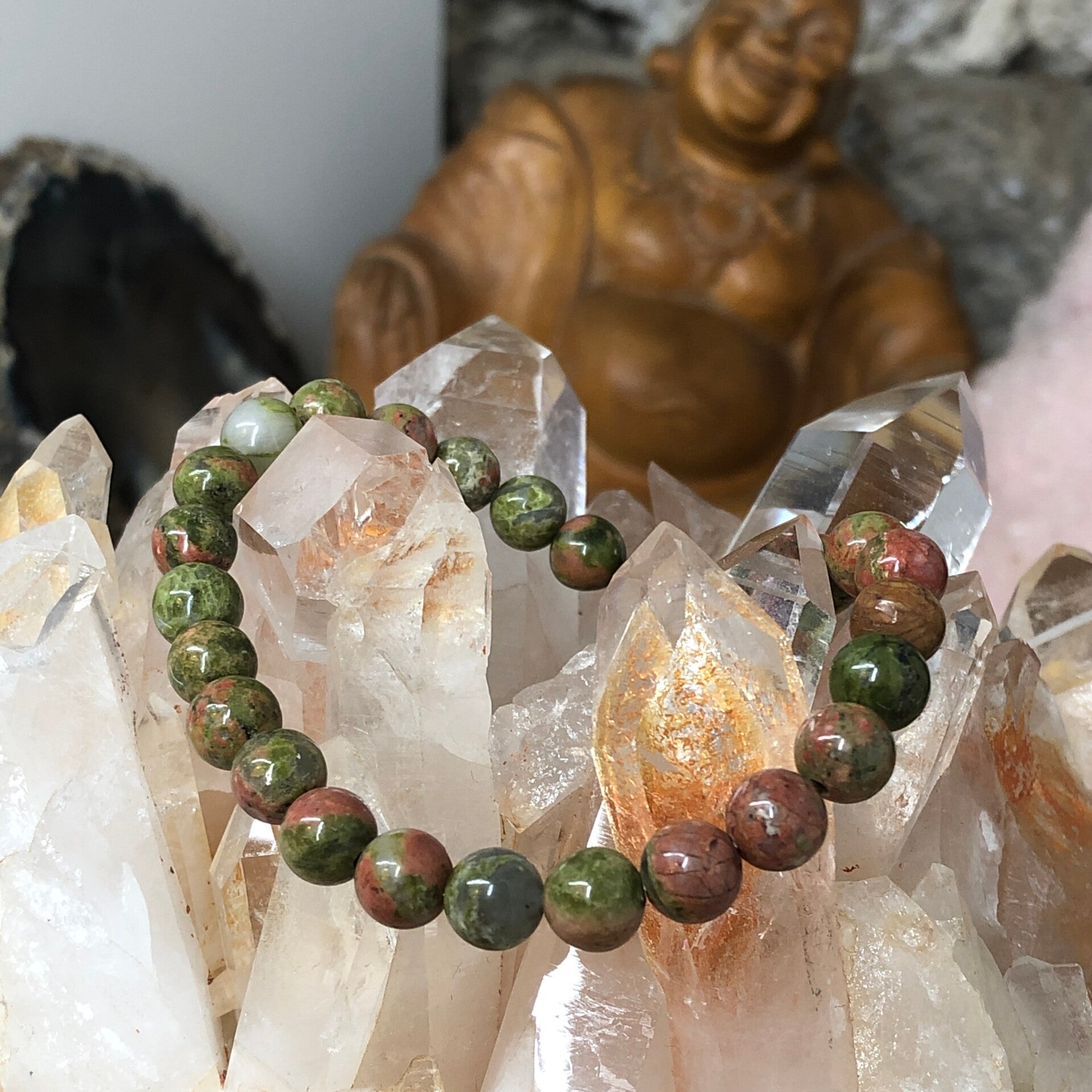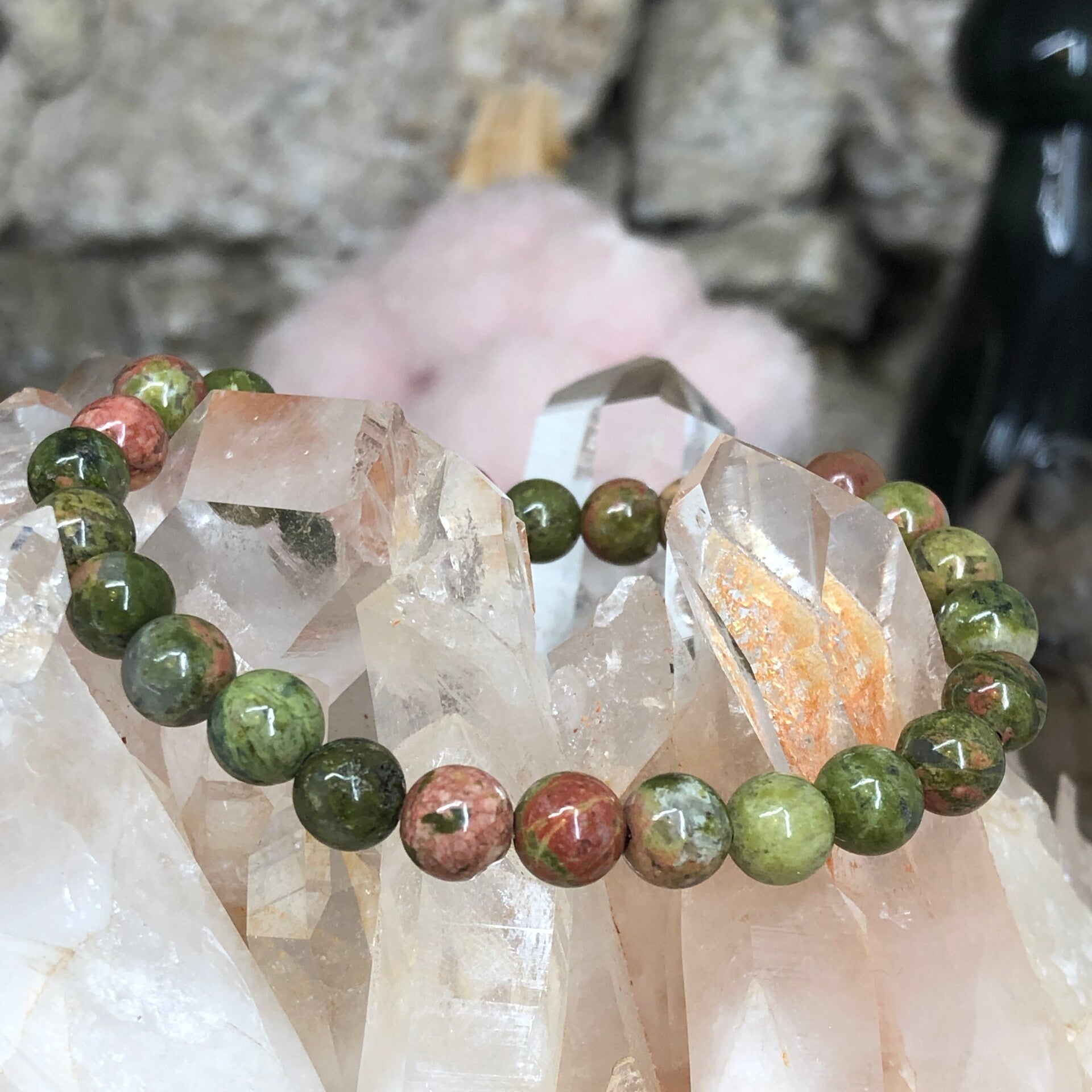 L'Unakite est une pierre de santé en général. Elle est très utile pendant une convalescence. Elle renforce le fonctionnement du foie, de la vésicule biliaire et des intestins. Elle améliore la circulation sanguine et les flux hydriques (cellules, reins, tissus).