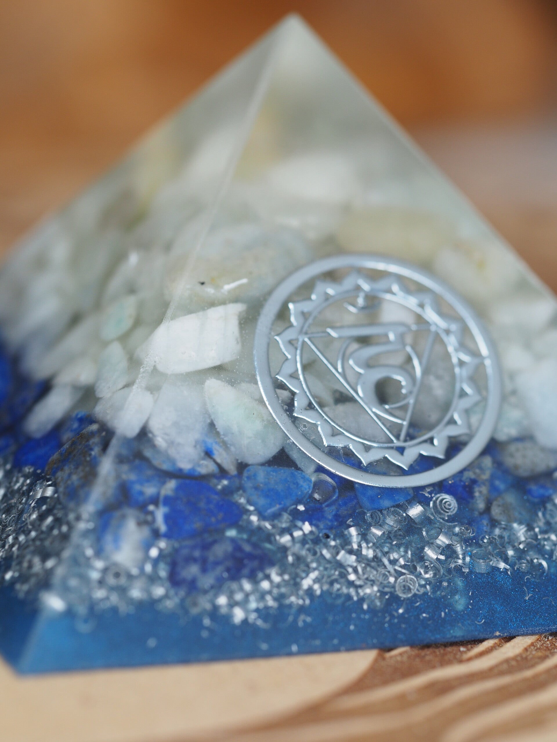 Orgonite pour favoriser la communication en Aigue-Marine, Amazonite et Lapis-Lazuli.