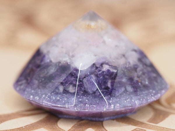 Constituée de cristaux, de copeaux de métal et de résine, l'orgonite capte les énergies environnantes, souvent polluées (énergies électromagnétiques, mauvaises pensées, etc), par son sommet, les purifie, puis les diffuse uniformément par chacune de ses faces.