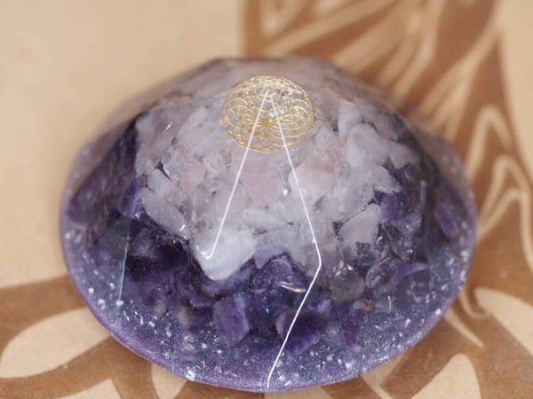 Orgonite pour favoriser l'Apaisement et le Sommeil en Améthyste et Quartz Rose.