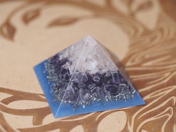 Constituée de cristaux, de copeaux de métal et de résine, l'orgonite capte les énergies environnantes, souvent polluées (énergies électromagnétiques, mauvaises pensées, etc), par son sommet, les purifie, puis les diffuse uniformément par chacune de ses faces.