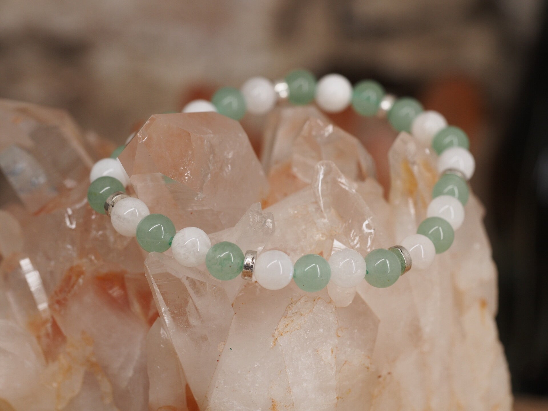 Bracelet Menopause en perles de Pierre de Lune et Aventurine Verte de 6mm monté sur fil élastique.