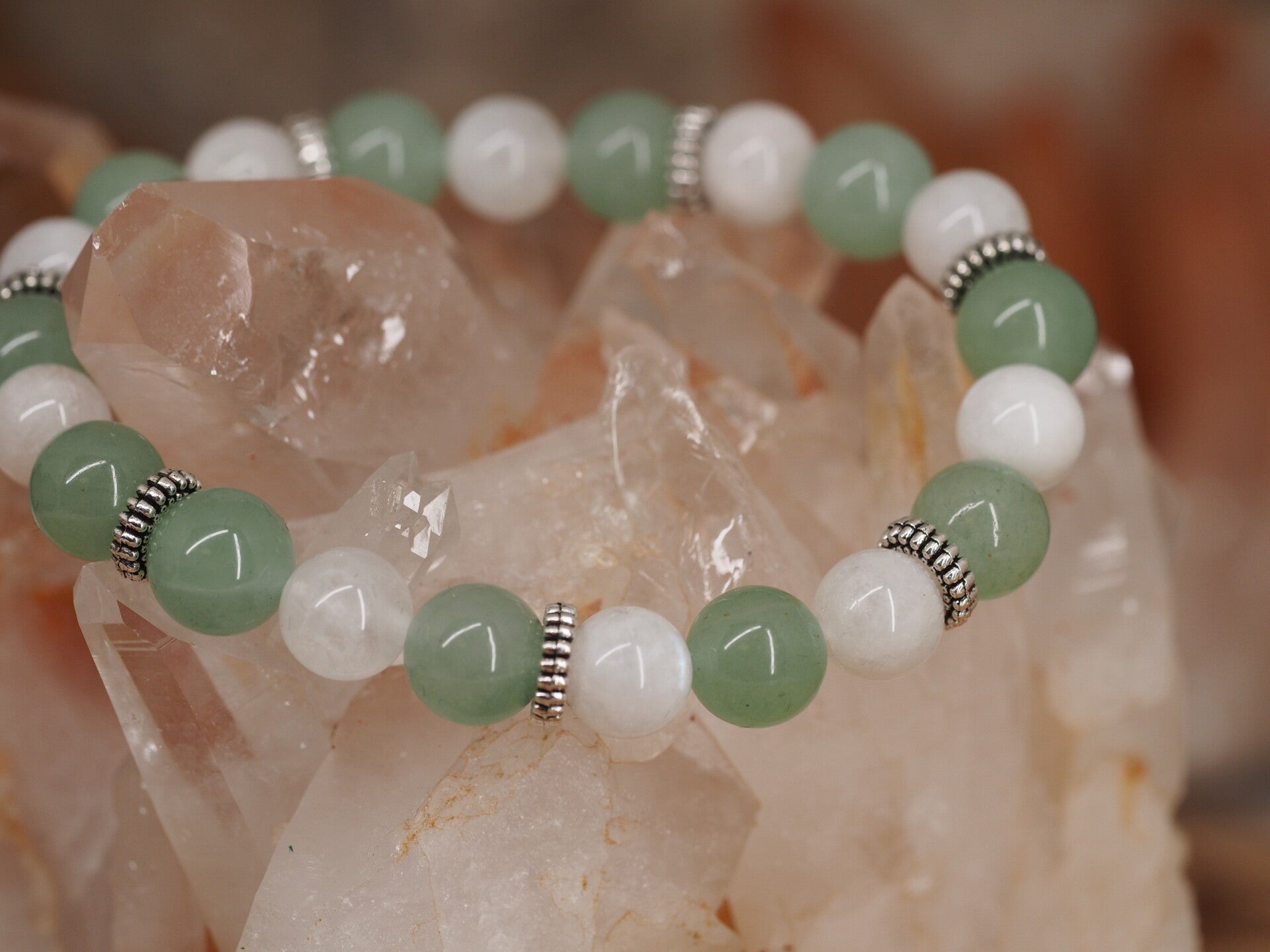 Bracelet Menopause en perles de Pierre de Lune et Aventurine Verte de 8mm monté sur fil élastique.