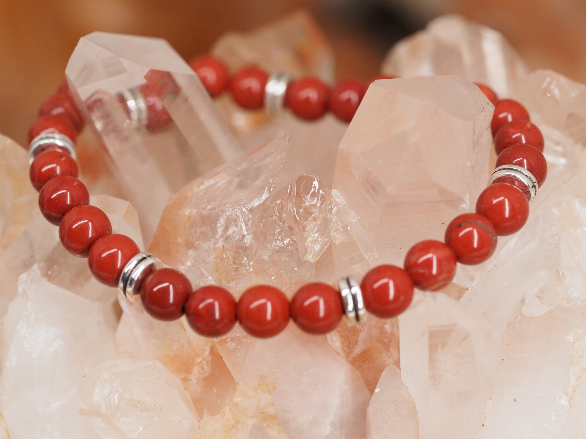 Bracelet en perles de Jaspe rouge 6mm monté sur fil élastique.