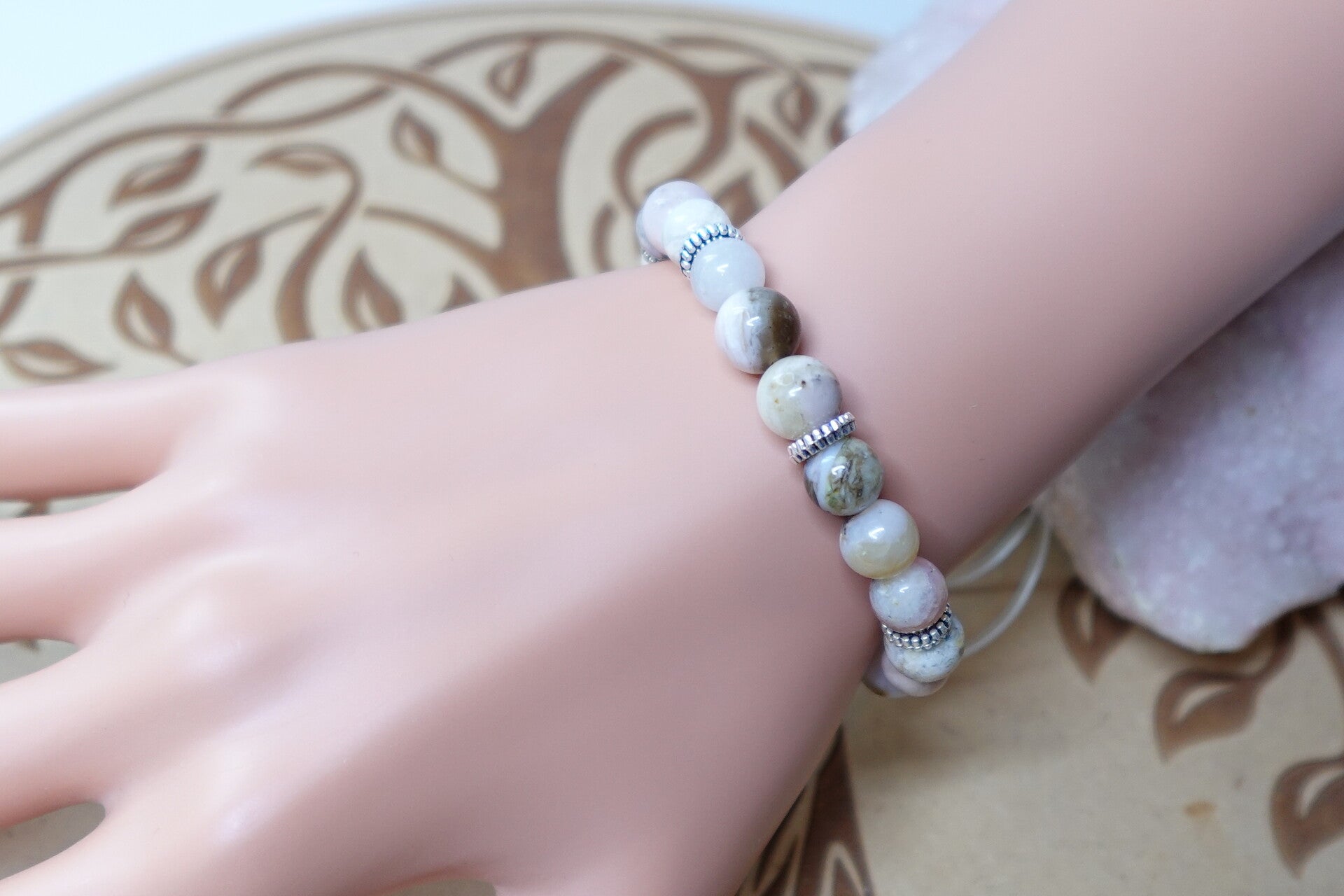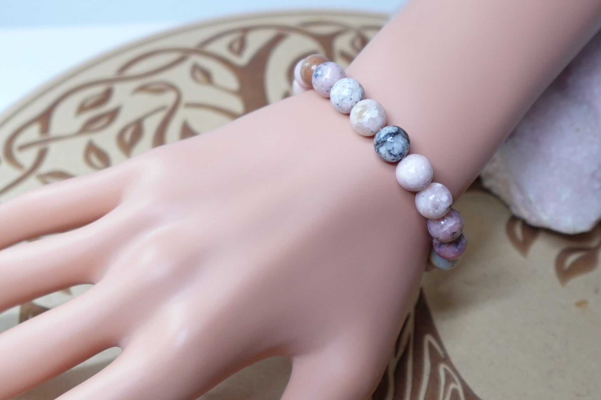 Bracelet en perles d'Opale Rose 8mm montées sur fil élastique.